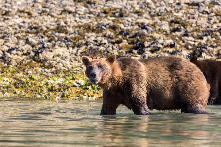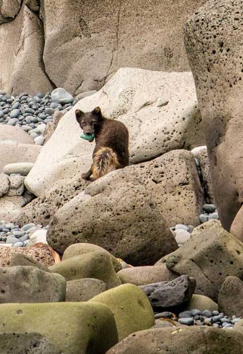A small group of fur seals bellowed, roared and squealed with dominant bulls, mothers and pups. A few curious animals swam around the zodiacs to get a close look at us – and provide excellent photo ops for photographers! Another highlight this morning was the Arctic foxes: A couple of families had dens at the base of the nesting cliffs. One adult was seen taking a murre egg from a nest and carrying it delicately home. Many kits played on the beach and curiously watched us watching them. There were also several harbor seals hauled out on low rocks which gazed at us with big eyes. All in all, it was a fantastic morning!