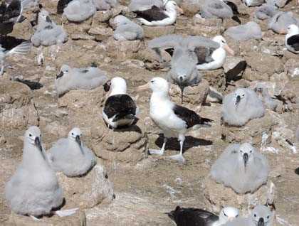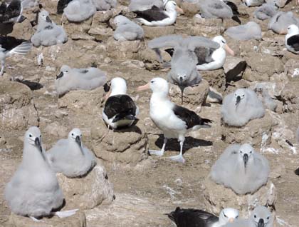 The island of Steeple Jason, part of Jason Archipelago named for the 17th century British exploratory ship JASON, is seldom visited by tourists, because its isolation and exposure put it in the path of strong winds and heavy seas that commonly buffet this western region of the Falkland Islands. Conditions, however, were quite good for us this morning. We arrived at low tide and knew the rising tide would improve the landing situation throughout the morning, so we attempted a rather difficult landing on exposed algal-covered rocks assuming it would improve as time progressed. Most everyone attempted it. The conditions demanded that everyone be careful, and as a result, there were no injuries. Once everyone was ashore, we hiked past lounging southern sea lions and continued a mile or so to view a low coastal region that contains the largest black-browed albatross nesting colony in the Falkland Islands…something on the order of 150,000 nesting pairs. This huge number is hard to imagine, especially since it has the potential of 450,000 birds when all parents and chicks are present at one time…which probably seldom occurs. For those who wanted close-up views of the albatrosses (as well as a few rockhopper penguins that had gathered along the edge of the rocks below the nesting albatrosses), we had to deal with a healthy, thick growth of tussock (tussac) grass. As people worked their way through this dense and thick vegetation that at times towered over our heads, people better appreciated the extent and importance of this native clumping grass that defines the Falkland Islands.  Most of it has long since disappeared with the coming of humans and their domesticated grazing animals in the 19th century, i.e. cattle and sheep, but many of the wildlife regions (including Steeple Jason) still abound with the stuff today. Once we pushed our way down through the tussock, we were rewarded with amazing views of nesting albatrosses and their large, downy chicks. This seems to have been a very successful breeding season, because literally every nest held a single large albatross chick. Generally, the adults court and lay their eggs in late September or early October. After about 68 days, the egg hatches and then it takes another four months or so to fledge the chick. Our visit today was about a month and a half before fledging takes place in late March.