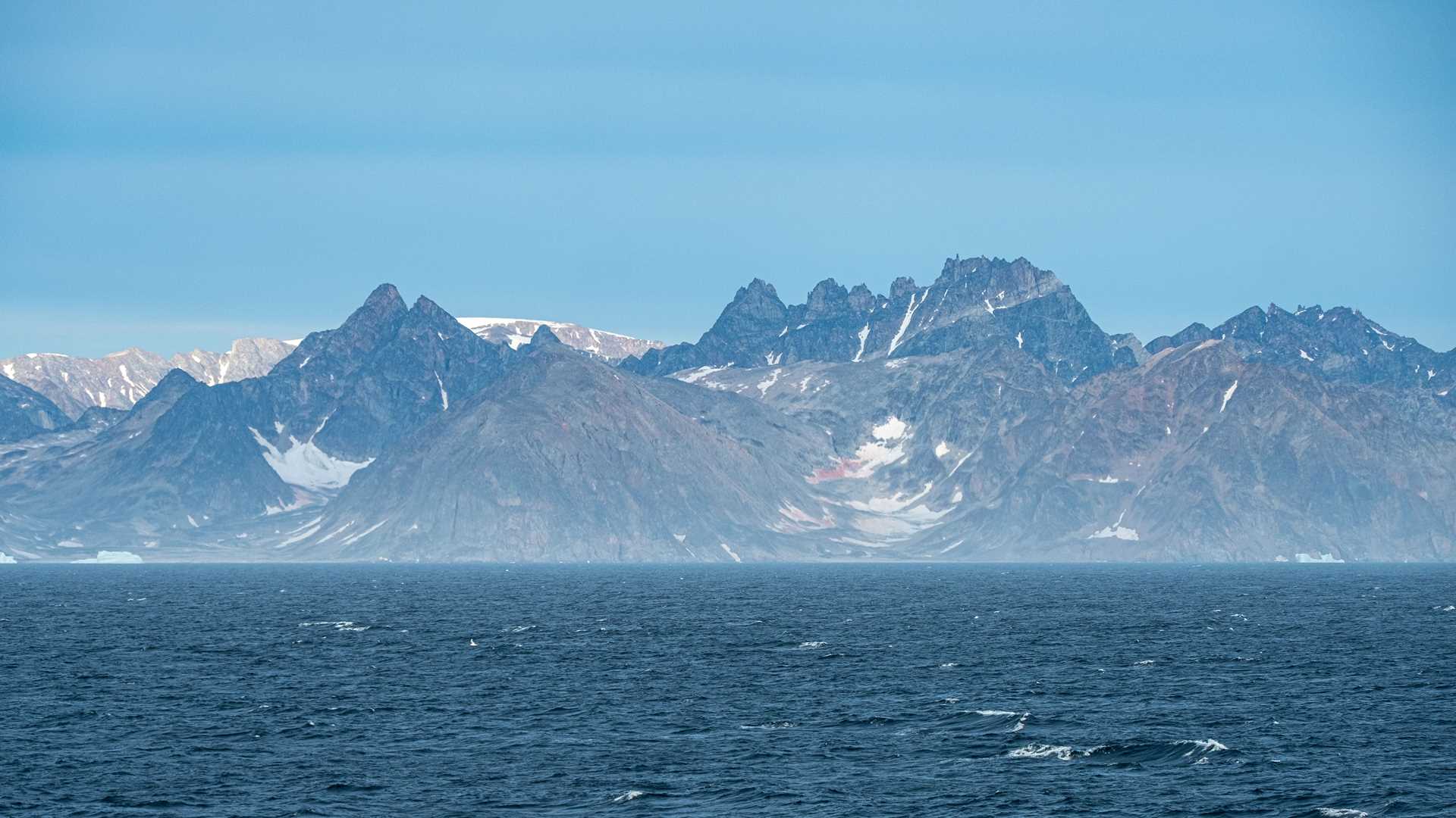 As we continued westward just before lunch, we began to see the faint outline of a mountain peak rising above the fog in front of us. Within five minutes, the entire landscape changed. The wall of fog seemed to suddenly disappear, and we were greeted with a wonderful range of mountains, glaciers, and even some large icebergs in the water. The incredible moment only got better as we moved closer to the mouth of the fjord and spotted blows ahead. We saw three species of whales in one place, including four fin whales, a couple humpback whales, and one minke whale. It was a grand welcome to Greenland, and we couldn’t think of a better arrival.