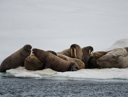 Eventually, it was time for the evening Recap, and then dinner, but the day still held more surprises for everyone! As the Explorer entered another area filled with miles of fast-ice, still attached to the shore, we hit the “mother-lode,” several bears were traveling across the ice, and a large group of walrus was hauled out along the edge of the ice. So slowly the captain brought us in close for a good look, and to our amazement there were several more bears that appeared almost out of nowhere, along with more walrus swimming along the ice edge. This was truly a wildlife spectacle, and an amazing way to end another expedition day in Svalbard!
