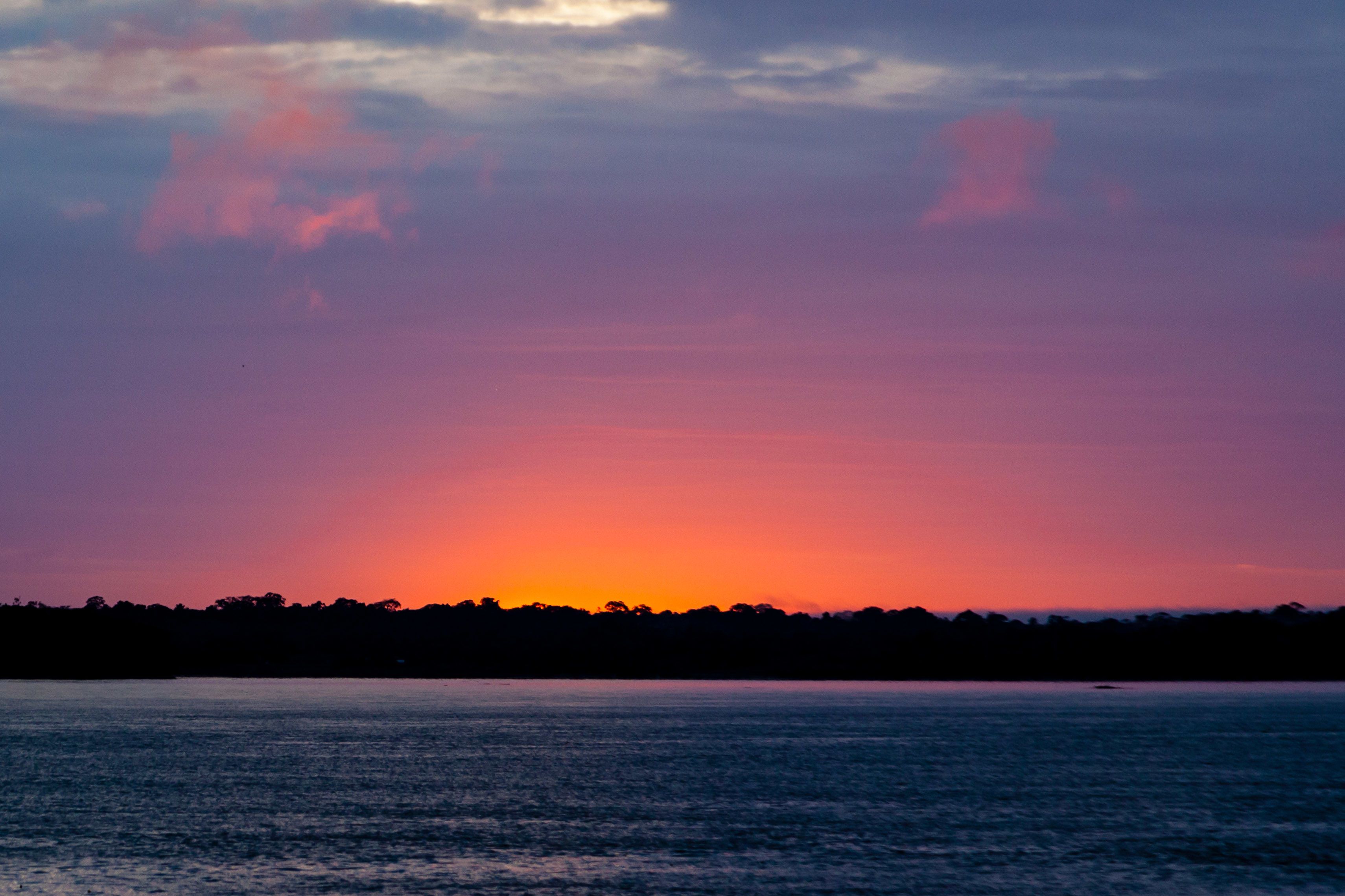 After lunch and the mandatory Siesta, we loaded the skiffs again to cruise the Yarapa River, visit Puerto Miguel and visit the incredible-giant lily pads. Again, we were rained upon with bird calls and various wildlife sightings. The community of Puerto Miguel gave folks the opportunity to visit another ‘local’ region and come away with some of the many handicrafts created by the local people. Many of these handicrafts are seen on the Delfin II, mostly around meal times at the tables. And finally, as if the excursions of the day weren’t enough, we visited the giant-Alice-in-Wonderland-type lily pads. These are tremendous and exceptionally photogenic with their pink flowers and brilliant greens.
