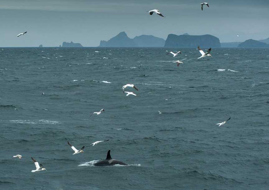 It was hard to decide which was more fascinating–the killer whales or the gannets. Mid-morning, our Captain spotted a group of whales in the distance; he was tipped off by the birds diving all around them. It had been a few days since we’d seen some whales, so everyone was excited to head to the bow and watch the action as we approached. We discovered there were three groups of whales, including males, females, and calves, and they were darting around, clearly feeding on something. Every now and then, one would lob its tail, lunge, or jump right out of the water. Killer whales are always a fantastic sighting, but these ones were almost shown up by the action of the seabirds all around them. A mob of gannets filled the air with movement. Gannets are large seabirds with long necks, a yellowish head and slender, pointed wings. Their feathers are so smooth, they seem to be molded from plastic. One of their special skills is a dramatic dive that begins high in the air. They fly straight down and pull their wings back at the last minute, entering the water with minimal splash and a short plume of bubbles. They look like needles making stitches across the surface of the sea. Between the whales, birds, and fish, the photographers could hardly keep up.