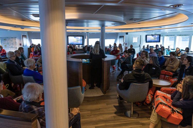 National Geographic Quest arose amidst light clouds within the protected waters of Ushk Bay. This area is known for a salmon stream and yields plenty of opportunity for kayaking and exploring the vast meadows of its inner waterways. On this day’s occasion, guests were able to hike and paddle their way along the coast of Ushk Bay and witness firsthand the life cycle of Pacific salmon making their way upstream. As we transited through Peril Strait, we were lucky to see humpback whales. These immense mammals were “lunge feeding” very near our ship. Being able to witness this event was unique for guests and staff. Lunge feeding is process through which individual whales push their gaping mouths through the surface and collect any fish or planktonic invertebrates in the process. Witnessing this behavior was truly a remarkable experience for all. We will cherish this moment for a lifetime.
