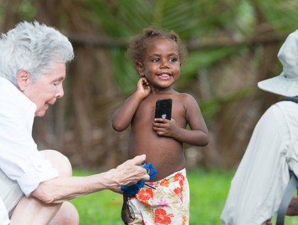 The ship anchored not far off our landing beach as we had lunch and then, with quite large swells running we embarked the Zodiacs to head ashore. This took a little time, with conditions not easy at the side-gate, but the crew and drivers helped us safely into the Zodiacs and ashore. On the landing beach we were welcomed by locals singing and dancing, and as we all gathered we had a special performance to greet us to this island. Of course for many the focus were all the very cute, smiling, friendly children, but the dances were excellent, and we had plenty of opportunities for photography.