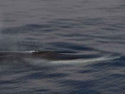 Time past, but no one seemed to mind that the first four hours of our day had already gone by and still it was only 7 a.m. We ate a civilized breakfast and then we were called to come back on deck as we were in the company of finback whales. In every direction we could see the spouts of whales as we now were in open water sailing along the ice edge. Then, in one incredible moment, two finbacks surfaced right in front of the ship. The entire outline of their bodies was easily visible as they swam just below the surface of the water. The sleek form of one of the fastest of the great whales left us speechless as it moved along the side of our vessel. It did not breach or even sow its flukes, however you could not have imagined a more exciting moment with whales.