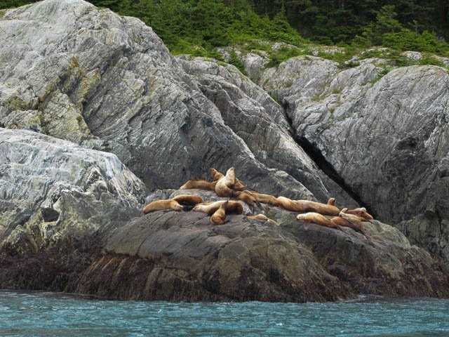 After breakfast we took to the expedition landing craft donning rain gear and warm hats and with binoculars in hand. We easily maneuvered through kelp and between jagged rocks, spotting grooming sea otters, boisterous sea lions, and nesting gulls. The waters all around us churned with immense power and the trees lining the shoreline were filled with more bald eagles than we could count.