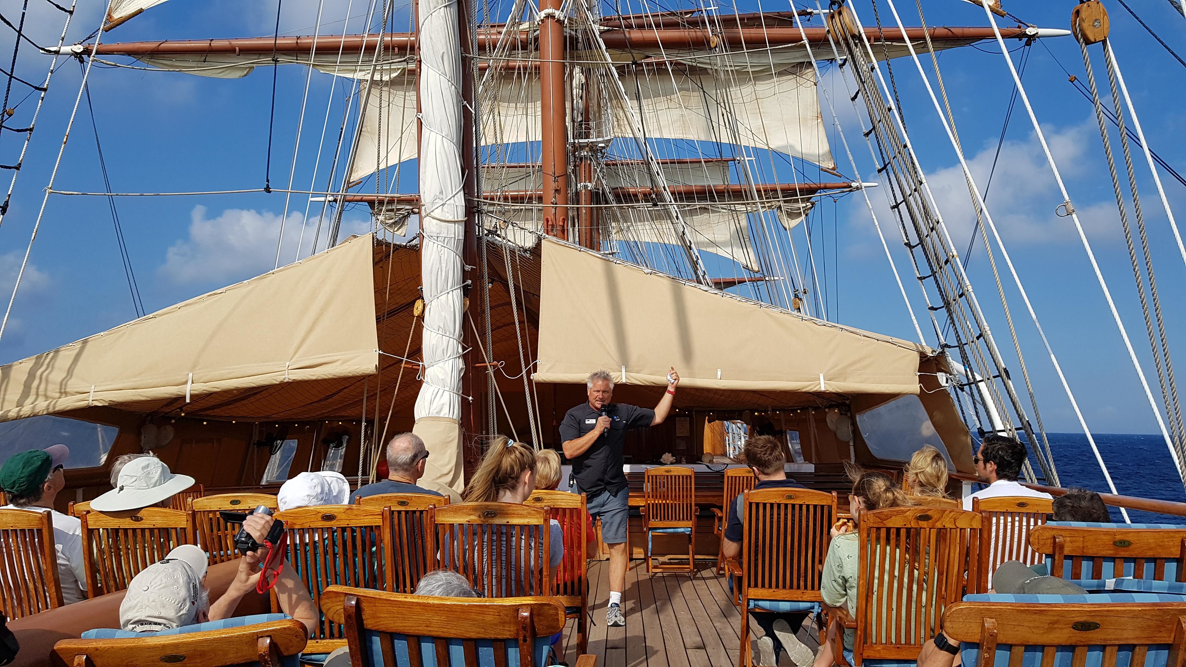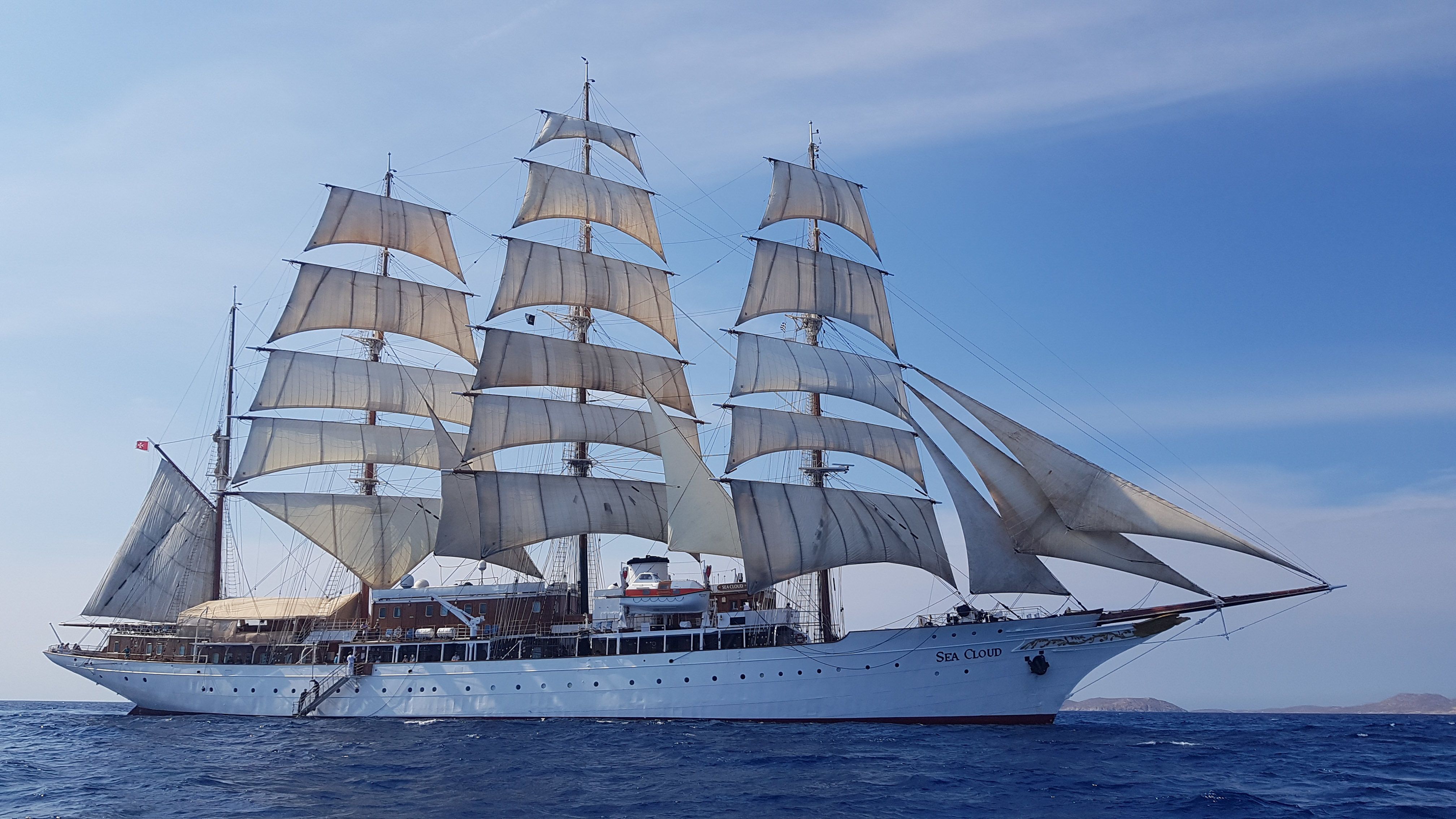 After lunch, we set sail at 2:15 p.m. At 3:30 p.m., Sophia and Angelos gave a very informative talk on the pantheon of gods from Greek mythology. Conditions suddenly presented themselves, and we were able to board Zodiacs and take photos of Sea Cloud under sail. After afternoon coffee and cakes, Lauren gave a very useful introduction to the iPhone camera and its possibilities. Next, we are sailing to the culturally significant island of Delos, the birthplace of the twin gods Apollo and Artemis.