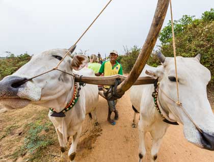 Dawn broke to the sound of monks chanting and wedding music on the opposite shore-side, and first light revealed a busy flotilla of sampans paddling two, three, and four people from one side of the river to Kampong Tralach on the other. As the landscape took shape, we could see a long line of oxen and oxcarts atop the riverbank, and a few of the Jahan sailors wading through the water hyacinth to secure the ship to the embankment and lay out the planks of our improvisational gangway. The oxcarts were for us, and we piled into the backs of them two-by-two to begin our bouncing journey through the rice paddies and lotus ponds. None of us had ever dreamed we would be riding oxcarts through the rice paddy dawn of the Cambodian countryside, but it was an absolutely unforgettable experience. With beautiful white and pink lotus flowers rising above the drying ponds, we couldn’t help but stop to photograph these holiest of flowers that are a symbol of Buddhism and enlightenment. Past a few rural brick factories we went, until the oxen stopped and we were told that we’d have to walk the rest of the way because there was a wedding going on adjacent to our destination at the local school.