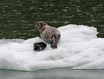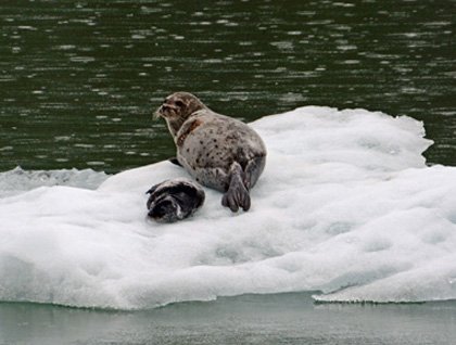 Spawned from the active calving glacier, ice pieces of all sizes littered the surface, most of their mass lurking underwater. Captain Nettles deftly navigated our vessel around the ice toward South Sawyer Glacier. From the decks we spotted harbor seals resting on icebergs: some lay next to recently born pups; others waited to give birth. Also using the ice, bald eagles hoped to get a nutritious meal from seal afterbirth. Blood-stained icebergs told the story.
