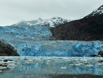 We rounded the final corner past Sawyer Island and gained our first view of South Sawyer glacier. We tiptoed through a maze of icebergs as far as possible before launching the expedition landing craft to take us further up the fjord. Icebergs of all sizes choked the narrow passage. We admired the beautiful ice sculptures the elements had crafted; towering spires, perfectly circular holes, and rounded cubes perched haphazardly on large floating tabletops of ice.