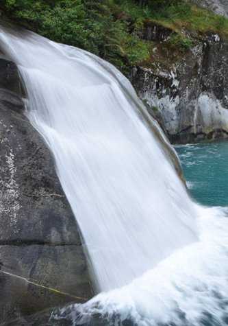 Tracy Arm is a narrow and spectacular fjord that averages only a mile in width along its entire 26-mile length. Sheer granitic cliffs towered above us and we could see abundant evidence that the valley had been carved by glacial activity, later to be flooded by the sea. The clear blue color of many of the icebergs made them look like precious gemstones and some icebergs even appeared to have been sculpted at the hand of an expert ice-carver. Against the sheer, glacially-polished cliffs we marveled at the classic signs of glaciation: glacial striations, bowl-shaped cirques, U-shaped valleys, and hanging valleys. We moved in close to a waterfall to take in the beautiful sight.