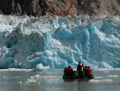 South Sawyer Glacier came into view and skies cleared. We spent the rest of the morning watching the glacier from our small boats. It sounded like thunder as it shifted, and we watched its icy blue and white face expectantly. When blocks of ice fell, we paid close attention, and we were very fortunate to see some large calvings. Enormous ice blocks seemed to fall in slow motion, and caused waves, which soon softened into gentle swells. We watched in wonder as the glacier dropped multi-ton pieces of itself into the sea.