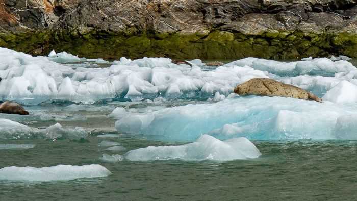 Continuing on, the wildlife sightings unfolded. At first, we saw a few dark dots on ice in the distance. Then we realized there were many more in every direction. The numbers started with just a handful, then seemed to multiply exponentially. Hundreds of harbor seals were hauled out on small and large pieces of ice on both sides of the arm. Their color patterns varied greatly, some appearing greyer with black blotches, some black with colored rings, and some with a simple silver coat. We navigated our small boats carefully, lowering our voices to a whisper, taking photographs without making too many motions, basking in the unique opportunity to see resting seals on glacial ice. At times, the only sound we could hear was the glacier cracking and rumbling in the distance along with a steady rhythm of popping ice below us.