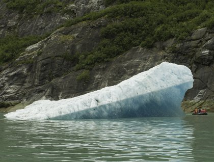 By the time we finished breakfast we had arrived at the head of the valley, in sight of the South Sawyer Glacier, where the granite walls soar three thousand feet above the water. Eager for a closer look we donned our life jackets and boarded the expedition landing craft for a tour though the headwaters of the fiord. Harbor seals watched us while we were watching crystal clear and cerulean blue icebergs. Pigeon guillemots and marbled murrlets floated nearby and some of us spotted a mountain goat on a ledge high above. And the highlight for everyone was the blue and white face of the glacier, deeply riven with crevasses, its face towering hundreds of feet about the glassy calm water. We watched and waited patiently and were awed by the spectacle of icebergs being born when pieces of the glacier thundered down into the sea.
