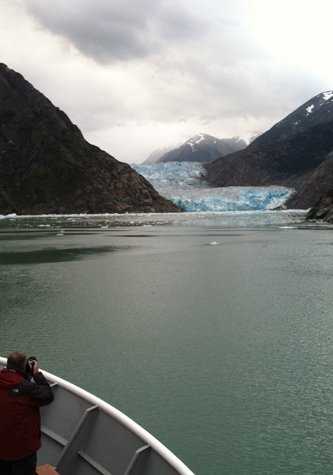 The National Geographic Sea Bird left Holkham Bay at dawn this morning and entered Tracy Arm, part of the Tracy Arm-Fords Terror Wilderness Area. Looking out the spa window I wondered how to describe Tracy Arm, how to do it justice? I saw water everywhere in all its forms … water flinging itself over 2,000-foot cliff walls to join 1,000-foot deep seas below, pencil-thin stream waterfalls, and massive gushing vertical waterways. Water-dense clouds covering the overcast sky and lower-lying wisps and puffs intermingling with the trees and vegetation and rocky layers of cliff wall. Steamy fog coming off the sea’s surface, which was also littered with ice chunks of various colors, shapes and sizes. Massive glaciers high up in the mountain tops, the weight of their dense ice pushing them downhill to meet the sea.