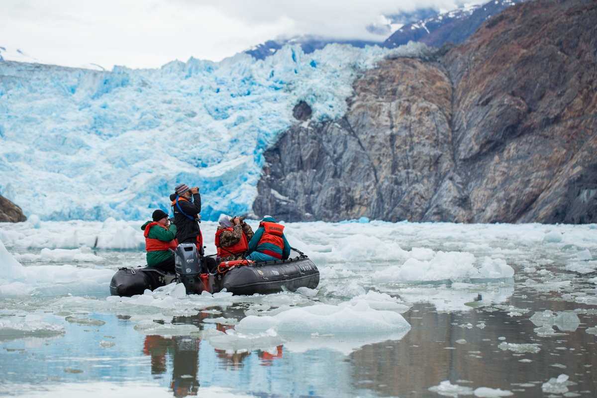 Our guests aboard expedition landing craft braved the rain as they maneuvered around the brilliant blue icebergs scattered throughout Tracy Arm. Cocoa-boats emerged in the distance carrying brave Viking women with hot chocolates in hand to keep everyone warm while enjoying views of the impressive glacier and the curious harbor seals peeking up through the sea ice.