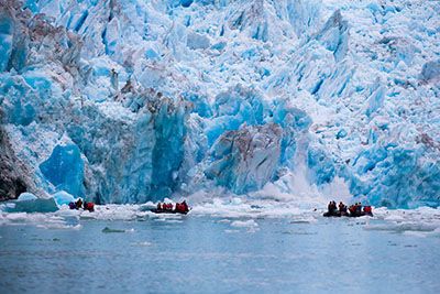 Not only does South Sawyer Glacier offer spectacular geology, but it is also the location of an actively calving glacier. Our nimble Zodiac crew disembarked National Geographic Quest and sailed toward the glacier to see and hear the calving, and to see the creation of icebergs. Not only were we witness to several large calving events, but on our way to the glacier face we were greeted by two charismatic mammals: mountain goats and harbor seals. We observed several hundred individual seal pups and mothers hauled on the ice, while we watched mountain goat kids and nannies foraging for alder among the steep slopes along the fjord. To cap off the Zodiac tour, our boats were greeted by a friendly crew of Vikings who served us hot chocolate. After our warm treat, we headed back to the ship for dinner and an overview of our exciting day ahead in the storied fishing town, Petersburg.