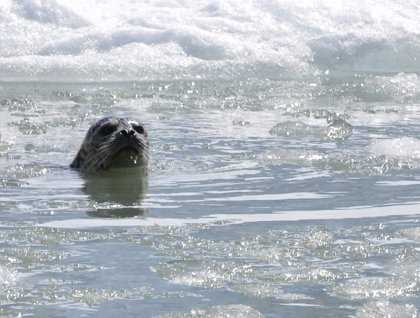 Out in the brash ice, harbor seals were abundant. Poking their rounded silvery heads between the icy bits, these large-eyed pinnipeds charmed us with their curious looks and quick movements. In the distance we could see many seals hauled out on floating ice—likely they are pregnant females about to birth their pups. The female harbor seals will nurse their young for three to six weeks and about the time the salmon enter the spawning streams, the mothers and their young will depart for some serious feeding. We could learn much from nature’s exquisite timing.