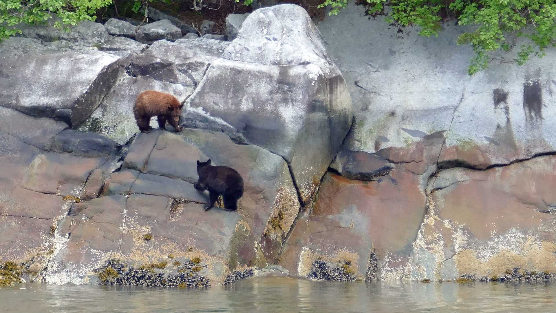 Bears have only recently left their winter dens and are busy foraging. The upper intertidal zone is one of the best food resources in spring, and the two bears we spotted were intently scraping up mussels and barnacles. Both of the bears were black bears, though their coloration varied. Black bears may be black, cinnamon, white, or even blue—glacier bears—so color isn’t a very good indication of species. Brown bears, also known as grizzlies, have a hump of muscle above their shoulders and a dished face. The absence of that hump and the straight nose on these bears were the easiest characteristics to distinguish.