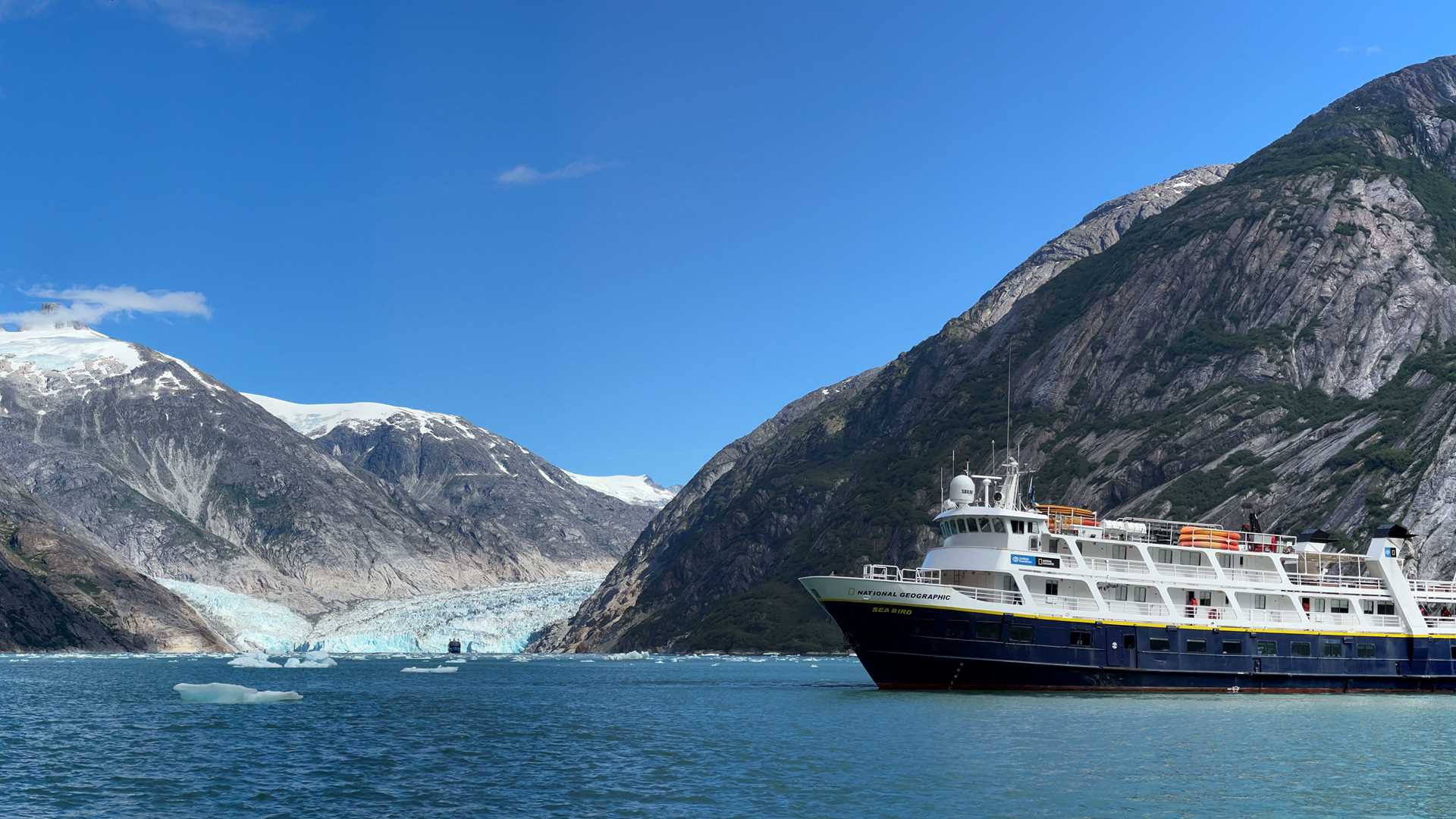 What a glorious day in Tracy Arm-Fords Terror Wilderness on our final day of this journey. We woke to beautiful clear skies as we passed Sumdum Glacier in Endicott Arm on our way to Dawes Glacier. As we sailed up the fjords towards the tidewater glacier, we were treated to spectacular waterfalls cascading into the blue water. Our first stop was a very low tide in Fords Terror. We could see rushing currents of the water exiting this fjord, making it impossible to proceed upriver due to the current. After lunch, we made it to Dawes Glacier, where we had our day’s activities. All guests were treated to a close-up view of this spectacular tidewater glacier with calving ice and plenty of harbor seals hauled out on ice floes. What a perfect way to end this epic expedition.