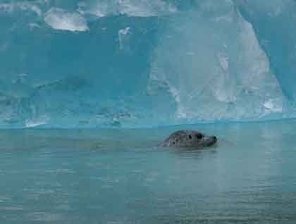 We awoke this morning with views of floating icebergs as we approached Sawyer and South Sawyer glaciers. The beauty of this area was first described in 1880 by John Muir. National Geographic Sea Bird and all aboard had the privilege to experience the vastness and grandeur of the towering cliffs more than 2,000 feet tall and the teal waters that go to the stunning depth of up to 1,000 feet. A valley glacially carved and gorgeous to behold! It is truly an area unique to photograph and observe the calving events at the glacial face and harbor seals and mountain goats.
