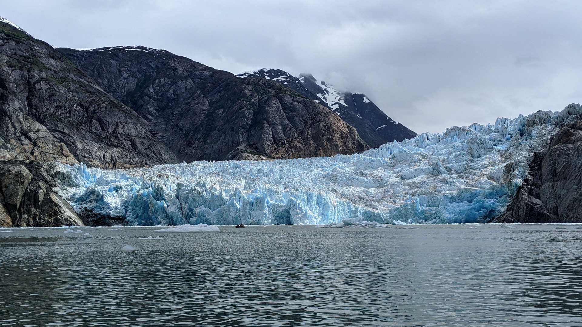 Cruising throughout the night, we awoke to the sheer granite walls of Tracy Arm rising thousands of feet over our heads. The cloudy sky started beneath the peaks of the surrounding mountains in the fjord, and more clouds appeared whilst we approached Sawyer Island. We were lucky to have an open path as the ship maneuvered through the ice towards South Sawyer Glacier. All our guests were able to spend at least an hour at the gorgeous face of the glacier. We got as close as is legally possible. The sun was shining behind the glowing blue ice as we crossed back and forth. Pupping season fully underway, we were able to view mother harbor seals nursing their young on floating blocks of ice. We were lucky enough to sit in awe multiple times as massive calving events sent ice crashing into the water below, echoing through the fjord.