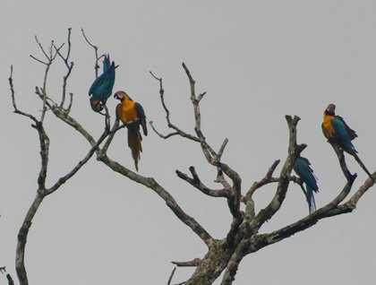 After heading upstream along the Ucayali River for a good portion of the night, the captain found a suitable spot to tie-up the Delfin II along the bank of the river. Our wake-up call came at 5:30, with just enough time to grab a cup of coffee, before boarding the skiffs for the morning excursion. The guides had a particular area that they wanted to explore, in hopes of finding one of the large parrots of the Amazon Basin, the blue-and-yellow macaw. These are a magnificent and beautifully colored parrot that frequents this particular region of the Ucayali, because of the presence of a particular type of tree that they use for nesting. We were not disappointed! Almost as soon as we crossed the river to the nesting area, a large number of the birds were visible sitting high in the tops of large trees, just back from the river bank. Everyone on the skiffs was treated to great views of the macaws as they flew from tree to tree, or sat in mated pairs on the highest branches; truly a wonderful sight!