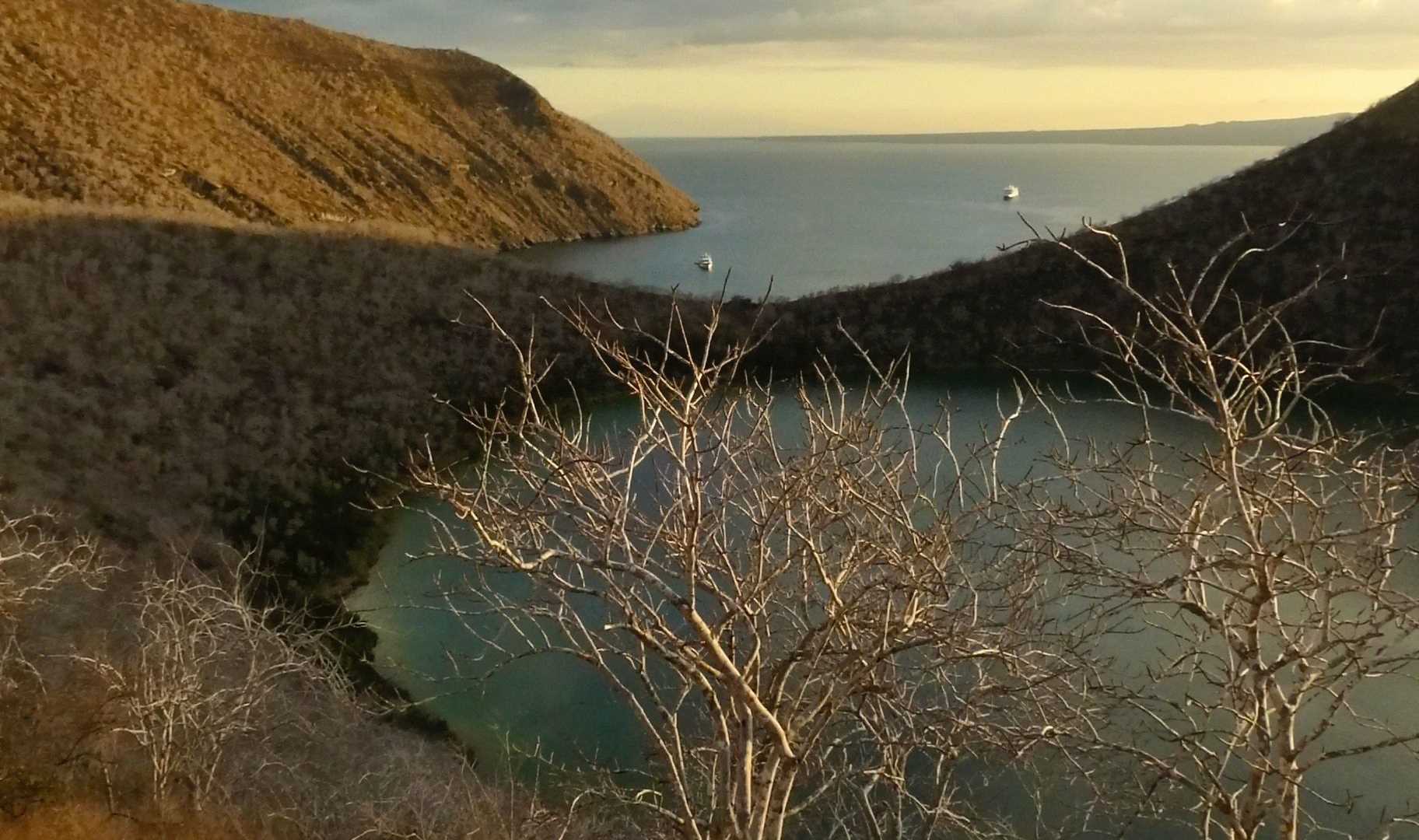 In the afternoon, we went for a fast-paced walk. We stopped at Darwin’s Lake, a turquoise and brackish lagoon, surrounded by a dense forest of palo santo or incense trees. We continued toward a lookout point from which we had an amazing view of the landscape filled with beautiful colors in the afternoon light.