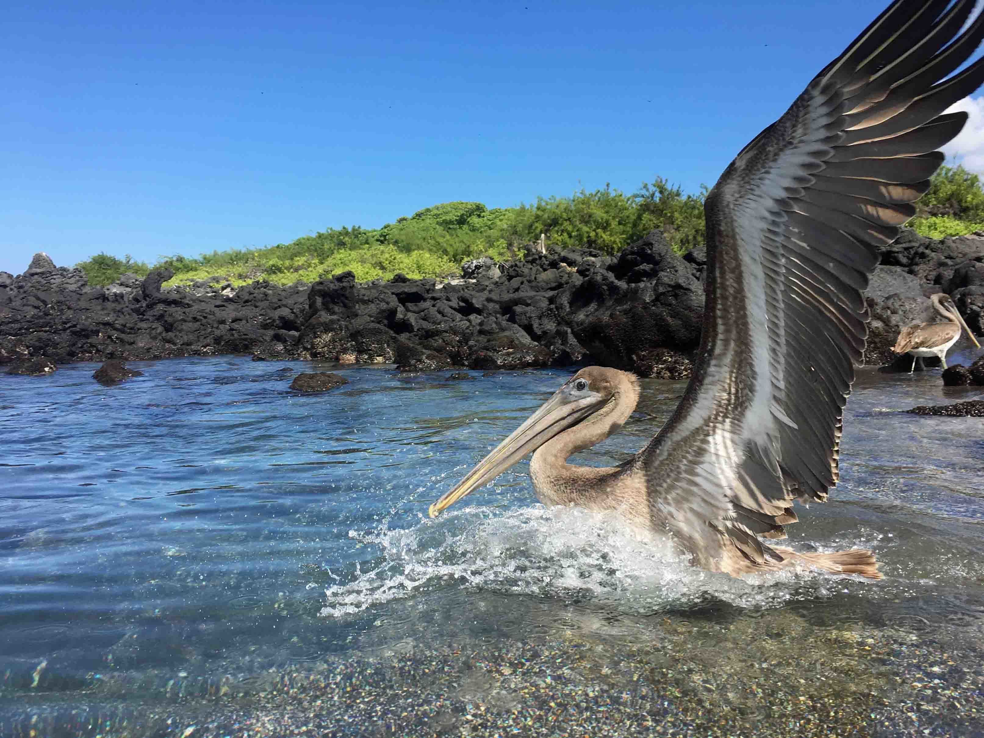 During the walk we were surrounded by salt resistant vegetation with Galapagos mocking birds and Darwin finches appearing on the top branches to sing. As we venture farther inland we come upon a hearty population of Galapagos Land Iguanas. We saw many of them along the trails. Many native and endemic flowers were found everywhere, including the beautiful Galapagos cotton and yellow cordia flowers. We saw several Galapagos giant tortoises as well. The latter sighting was a grateful surprise. At the end of the walk, we had the chance to cool off in the black lava-landing beach with the company of many juvenile brown pelicans who let us share their space with them.