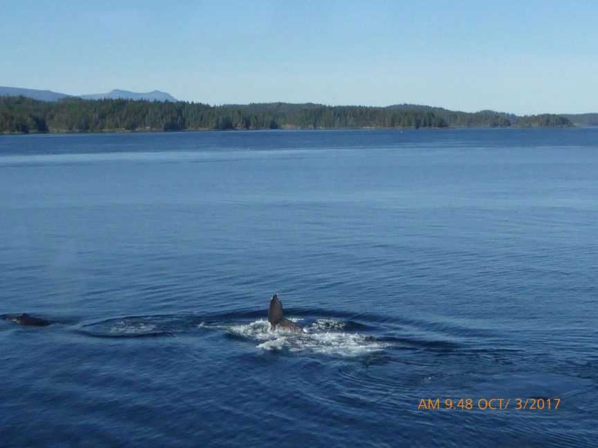 A beautiful sunrise followed the early morning star gazing with nary a ripple on the ocean surface. Suddenly a pod of Pacific white sided dolphins sped by on the port side of our ship, the National Geographic Quest. This was followed by another pod that went by on the starboard side. Soon another pod was seen in the distance. Sometimes these dolphins will stop to play with the bow wake, but today they seemed to have another purpose, and instead sped by in pods numbering in the dozens. As we approached Blackfish Sound, we decided to take a detour and see what might be in this quiet little area. We weren’t disappointed. There were six humpback whales swimming and feeding. They raised their backs in the distinctive “humpback” pose and lifted their tail flukes straight up as they dove down for a dive. These magnificent baleen whales can get up to 60 feet in length. Off on one of the rocky shorelines, were over 30 Steller sea lions sunning themselves in the early morning sun. Others were swimming among the humpback whales, but both were foraging for small fish.