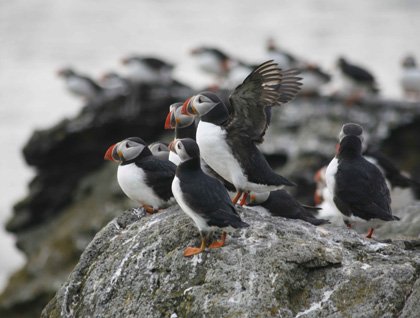 A 6:30 a.m. announcement that a pair of humpback whales were just off our bow began our morning as we sailed toward Vigur Island in the West Fjords of Iceland. Slowly cruising through the water, these wonderful animals were feeding. With a backdrop of basaltic cliffs and whirling seabirds,  the scene was a splendid photographic opportunity which many guests took advantage of. Our anchor dropped, the first Zodiacs headed to the small floating dock on the small island of Vigur. There we were warmly welcomed by Magnus, one of the sons of the owners of the island, which is now a nature reserve. It had been in the possession of his family for several generations. Fishing, raising sheep , catching puffins, and gathering the down from eider duck nests have been, and still are, the mainstay activities here. Sixty kilos or so of eider down are processed each year. Thousands of puffins, black guillemots, and arctic terns frequent the island which is in addition a veritable rock garden of wild flowers. Our short visit completed, we returned to our ship for a relaxing morning as we continued our explorations of the West Fjords.