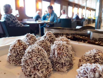 After the walk, Bjorn shows us newly collected eider down and the finished down ready for sale. He compresses some into the size of a golf ball, and when he opens his hand, it quickly puffs up to basketball size. It is amazingly light and fluffy, a perfect insulator. We wrap up our visit with some delicious cakes and coffee in the converted old barn watched by a couple of curious sheep.