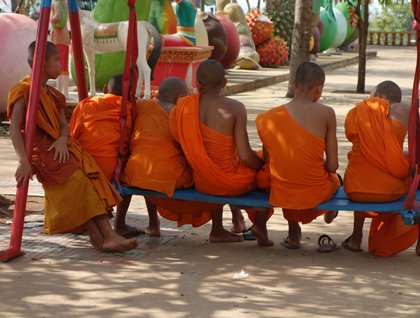 Back on the Jahan, we wait for two monks to arrive to do a blessing ceremony for the guests and the Jahan staff on the terrace deck. Two chairs are arranged in front of a table, filled with flowers and fruit. The blessing is recited in both Pali and Khmer, while water is sprinkled on the respectful crew seated on the floor with head bowed and hands pressed together. Donations are collected for the monks and their temple, and fruit and food are offered to the monks. One of the guides explains the proceedings and answers questions. It is customary to show respect to the monks by touching the ground or move the hands in prayer three times to indicate the Buddha, Dharma (or Teachings), and the Sangha (or Monkhood).