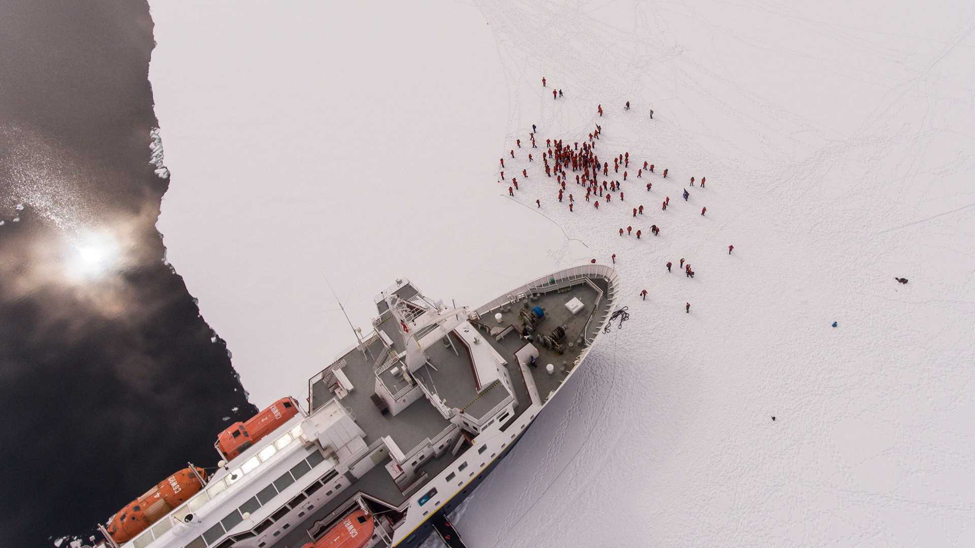 Happy Thanksgiving from Antarctica! Having found a large piece of shore-fast ice (sea ice that is attached to land and therefore stable) the captain parked the ship in the sea ice for the evening. We woke up to a cloudy but beautiful day, the gangway was lowered after breakfast and we were able to go for a walk on the frozen ocean. Many didn’t think about the 1,500 feet of ocean beneath our feet or the six feet of ice we were walking on. The clouds lifted and the surrounding landscape was exposed. Beautiful mountains and tall cliffs were all around us. Several seals and penguins came out of the water near National Geographic Explorer to see what all the fuss was about. Many guests built snowmen, some walked the perimeter, a few even jogged for a unique Antarctic workout. The hotel department served hot chocolate with an added kick to top off our experience. After a group photo was taken in front of the bow it was time to extract the ship from her icy berth and move on to other adventures.