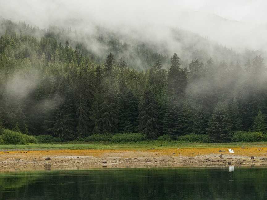 We slip quietly into Williams Cove. There are misty clouds twining in the trees around us.  Icebergs in fantastic shapes float, reflected in calm water. There is some early morning fun on the bow, guests saying what each berg looks like: a snail, an otter, a whale’s tale. Then its breakfast, and we’re off for an expedition morning. Long hikers make their way through old forest, stepping over roots and through streams, following bear trails, climbing to a lovely meadow. Our feet squish on the moss, birds are singing, and the low bright plants of the Alaskan muskeg surround us. There is a pond, with a few blooming water lilies. “This place,” someone says, “is the most beautiful place we’ve been yet.”
