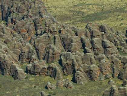 Purnululu, or Bungles Bungles, is a national park declared a World Heritage Site by UNESCO in 2003. This geological landscape is unique and the sheer grandeur of the sandstone massifs did not fail to impress. Rising up to 578 meters above sea level, these rocks are about 350-375 million years old. Aboard our flight-seeing planes, we observed the grouping of multicolored domes and the alternating layers of orange oxidized iron and gray cyanobacteria of this cone-karst geology from the Devonian Age. Although this region was extensively used by Aboriginal people for 40,000 years, few Europeans knew of its existence until 1983.