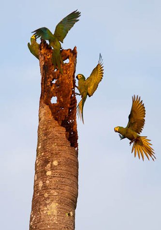 We started out the day very early in the morning so that we could spot some of the most fascinating birds in the Amazon forest: macaws. There is a place up the Ucayali River called Yanallpa, which means "black earth" in Quechua language. Here, blue and yellow macaws and red-bellied macaws nest in the fallen aguaje palms. In order to get a good view from our skiffs, we had to be there shortly after sunrise. We had a very pleasant morning listening to the birds and watching the magnificent giant parrots fly in the wild.