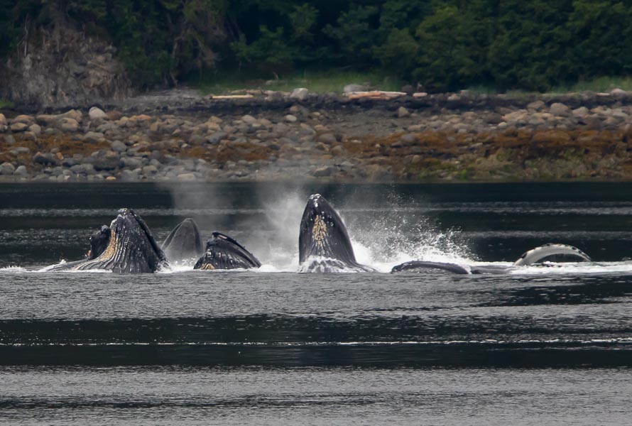 While heading towards Youkeen Inlet, we spotted numerous columnar blows on the horizon. These whale blows were very close together. We had found what we were looking for. A group of humpback whales were exhibiting a cooperative feeding behavior. As the National Geographic Quest got closer, we counted twelve whales that participated in the group. We stayed with them for some time, and at the end, when we though the experience was about to end, one whale breached right after another on a spectacular double breach!