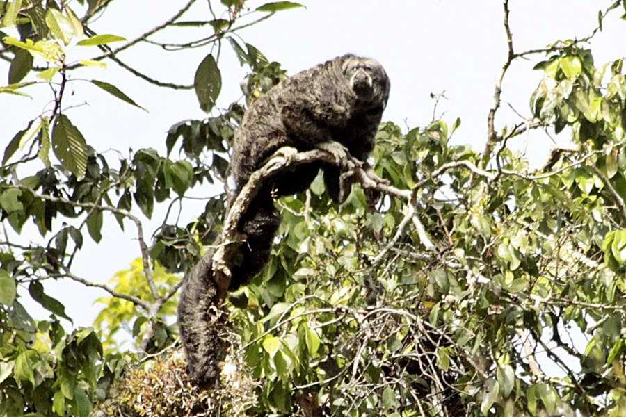 Monk Saki Monkeys (Phiteciamonachus) are generally quiet but when heard they make peculiar calls unexpected in monkeys, they vocalize high pitched whines, grunts and bird-like chirping sounds.   This relatively large monkey weights approximately 2.5 Kg (a little less than 6 pounds) but is appears to be bigger due to the thick fur hair that covers most of its body. The thick bushy non-prehensile tail is long and characteristic. It has been suggested that this thick fur, unusual in the tropics, protects the monkeys from insect bites. This monkey species is one of my favorites ever. When travelling, they make acrobatic movements extending its arms just like “flying” from branch to branch. The latter behavior is the origin of one of their common names, “mono volador” which is Spanish for flying monkey.