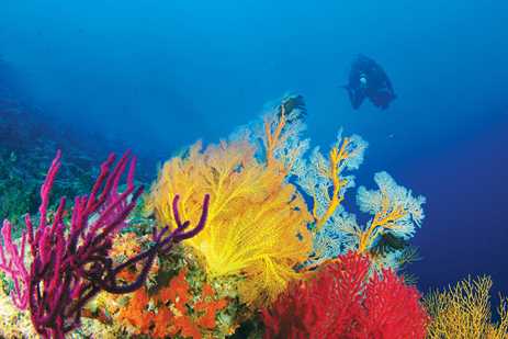 An astounding 600 species of reef-building coral thrive in this bioregion that truly lives up to its name. To put that in perspective, there are only 60 coral species in all of the Caribbean. More than three-quarters of all known coral species—15 of which are not found anywhere else—compose the reef walls and ocean caves of the Coral Triangle. Indonesia’s Raja Ampat archipelago is the epicenter of this coral diversity. In turquoise waters with corals ranging from the massive boulder-like honeycomb to delicate tree-like carnation coral, snorkelers find many wonders including walls of fish and seven species of giant clam.