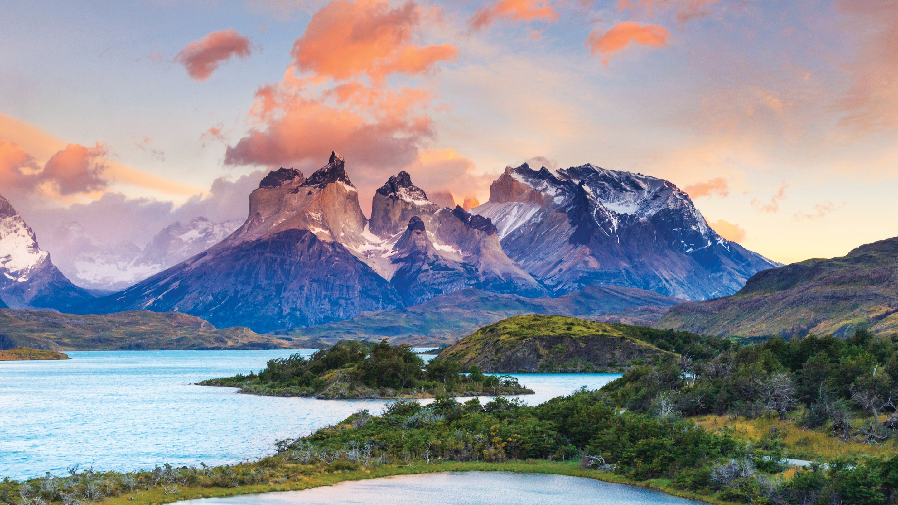 In the Magellanes region of southern Chile, Torres del Paine National Park spans 450,000 acres between the Andes Mountains and the Patagonian Steppe. In addition to its eponymous mountain range, the ecology is made up of glaciers, lakes, rivers, lagoons, and four distinct vegetation zones: the wind-bent grasses of the steppe, the pre-Andean scrub of the plains and plateaus, old-growth deciduous forests, and sparse Andean desert. Puerto Natales is the nearest city, just over 70 miles southeast of the park.