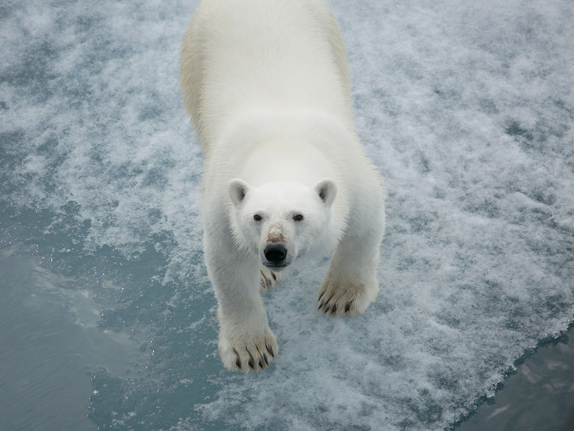 A young female bear, curious and fearless, stares up at guests aboard National Geographic Resolution. This was...likely a bear whose mother had recently sent it off to make its way in the world. Such bears can be trouble because they haven’t yet perfected their hunting skills and they haven’t always learned to avoid humans. She approached the ship with no hesitation, showing none of the signs of anxiety or wariness we saw in the older male bear earlier in the day. Her biggest concern seemed to be whether she would be able to board the ship to investigate those intriguing smells. —Daniel Odess, Cultural Specialist