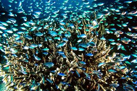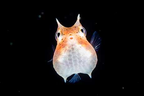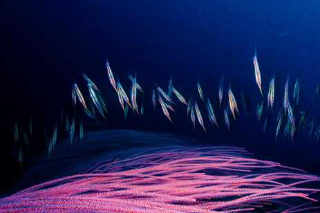 Although the couple hopes to encounter new creatures each time they dive, there are two species which they’re happy to see time and again. For Hayes, it’s the wobbegong shark. “They are a quirky shark designed to live on the seafloor and they often lay about on large table corals for hours at a time. They have a fringed mouth that attracts prey, but it also makes them look a bit like a giant tawny-colored bathmat,” she says. Doubilet’s favorites are the large schools of sweetlips that live on many reefs—they’re bright yellow with stripes and bubblegum-pink lips.