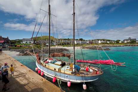 From the deck of the Lord of the Glens, docked for the evening in Tobermory on the Isle of Mull, you have two wonderful things to relish: the Spanish galleon San Juan de Sicilia, sunk somewhere right out there in the bay (laden with New World gold, according to legend); and the fact that a really wonderful Scottish pub is just a short stroll down along the colorful storefront street. Known for the signature red, yellow, and blue buildings that the children’s television show Balamory made famous, this has to be one of the prettiest waterfronts of any Scottish island village. It’s a planned village, built in 1788 and designed by Thomas Telfod, that same engineer whose imprint is scattered all over Scotland, from big projects like the Caledonian Canal down to the plan of village churches like the one on Iona.