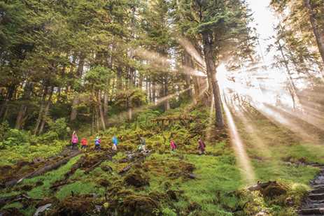 Spanning nearly 17 million acres, Tongass is the world’s largest intact temperate rainforest—an increasingly rare climate of year-round moderate temperatures and heavy precipitation. An annual 140-160 inches of rain renders the forest too wet for fires, so Sitka spruces, western hemlocks, and cedars continue to grow for centuries, some reaching heights of over 200 feet. Mosses, ferns, and lichen decorate the understory as if preparing it for the pages of a fairytale. The rivers within teem with all five species of Pacific salmon, making it a hunting hotspot for bald eagles and coastal brown bears. Even the forest floor is a kaleidoscope of character—carnivorous plants, fuzzy caterpillars, and red and orange mushrooms pop against the sea of green.