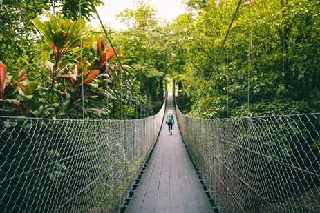 Cloud forests are nature’s original terrariums. In Monteverde, where the mountains meet the tropics, consistent cloud cover drapes the canopy in a dreamlike haze. As the clouds condense, water drips down into the lush understory to nourish the forest’s 3,200 plant species. The humid climate is especially perfect for epiphytes—plants that absorb their nutrients from the air like lichen, bromeliads, and orchids. Over 500 species of orchids have been identified here—more than any other place in the world. Get up close to the canopy on one of six suspension bridges to experience the vantage point of the reserve’s 400 bird species, including the resplendent quetzal and 30 kinds of hummingbirds.