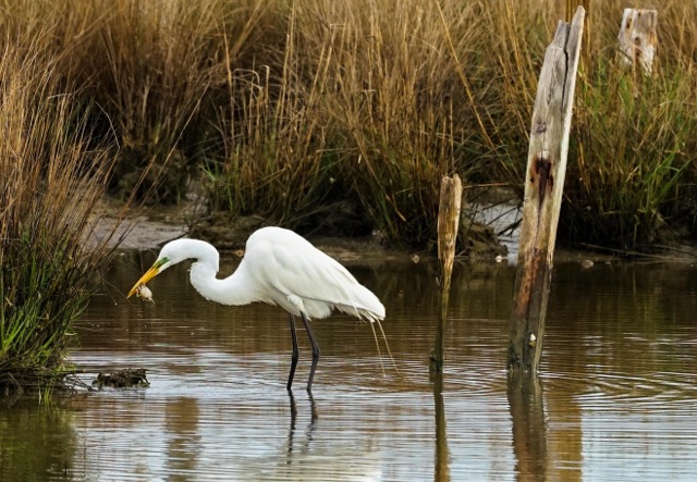 A great heron catches a Chesapeake blue crab on idyllic Tangier Island.