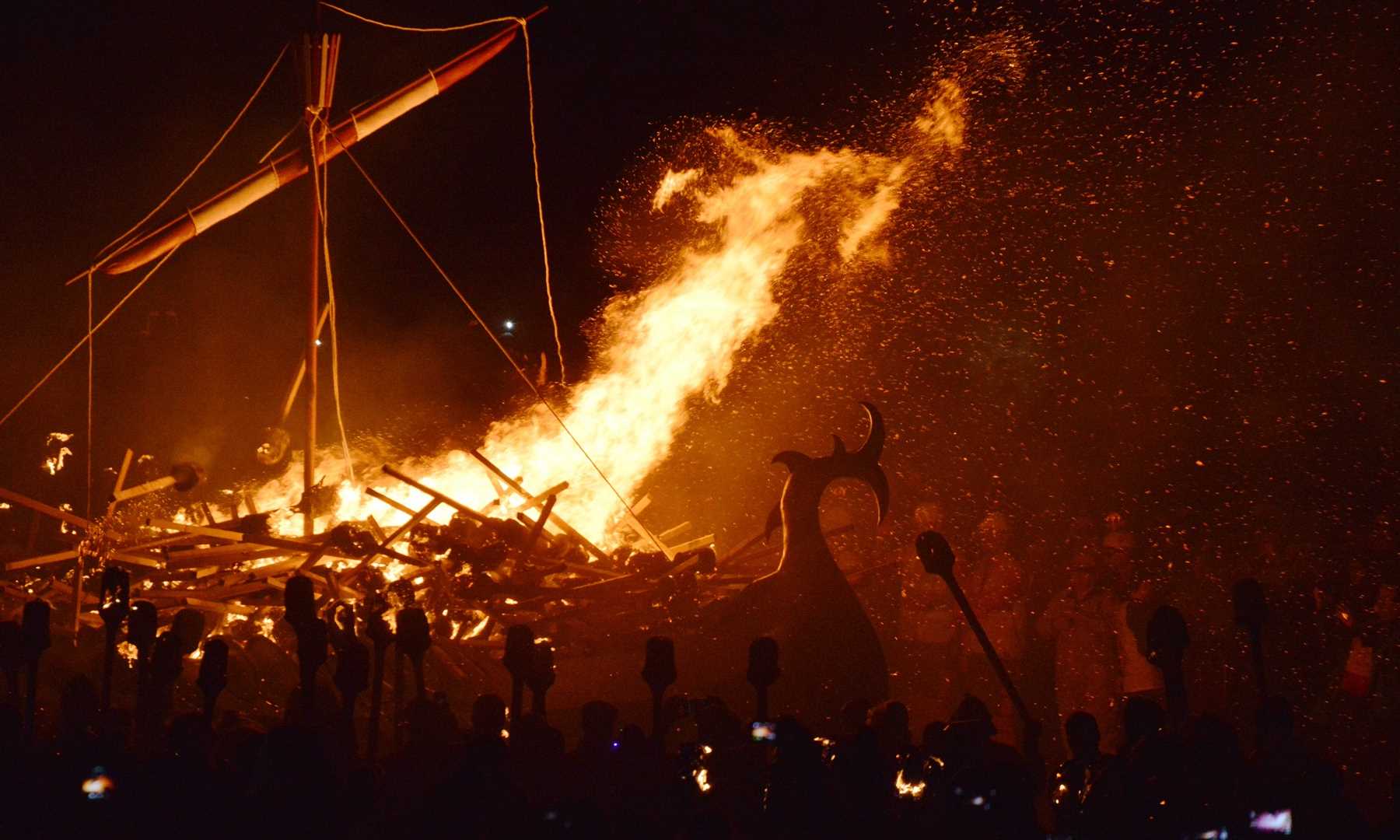 But ask any Shetlander if winter is grim and they will laugh and tell you about Up Helly Aa—Shetland’s world-famous fire festival when islanders look back with pride to their Scandinavian heritage. The words translate roughly as Up Holy Day All and it marks the end of the Christmas period and the beginning of lighter days. The main celebration happens on the last Tuesday in January in Lerwick, the principal town, where thousands of individuals take part in an unforgettable spectacle. The centerpiece is a torchlit procession of squads of participants (known as guizers) through the narrow streets dressed as Viking warriors and to be chosen as their leader, or Jarl, is an honor. The grand finale involves throwing the flaming torches into a replica Viking ship and singing while it burns, sending sparks spiralling high into the night air—a sight guaranteed to drive away the worst winter blues. Spin-off events involve feasting and drinking, music and dancing, singing and storytelling, and community-based events continue throughout January and into March in smaller villages and on outlying islands.