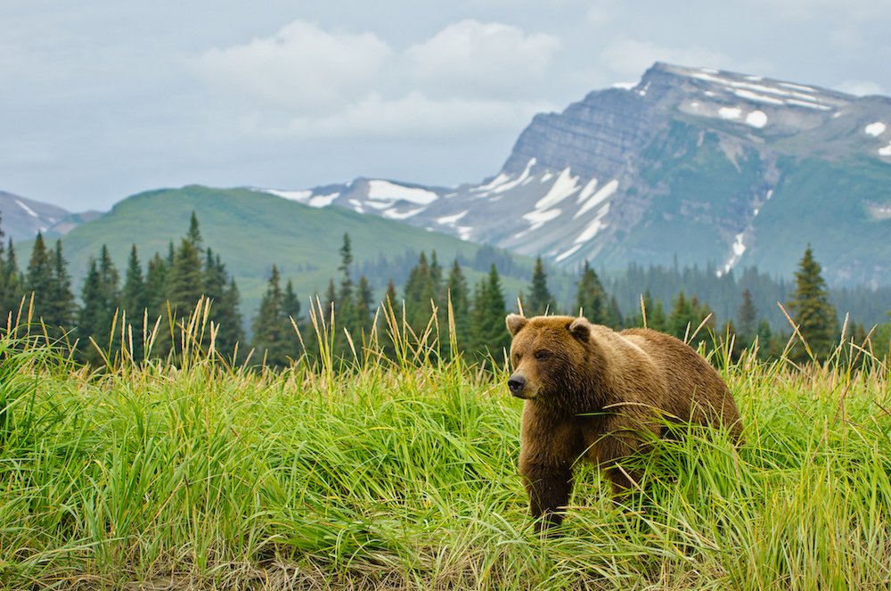Closely related to the brown bear, grizzly bears are a subspecies whose main differentiator is location. Grizzlies can be found in the interior of Alaska where they forage among the forests, fields, and streams for grasses, roots, berries, worms, and ants, as well as hunt for a range of prey from trout to squirrels to larger animals like elk.