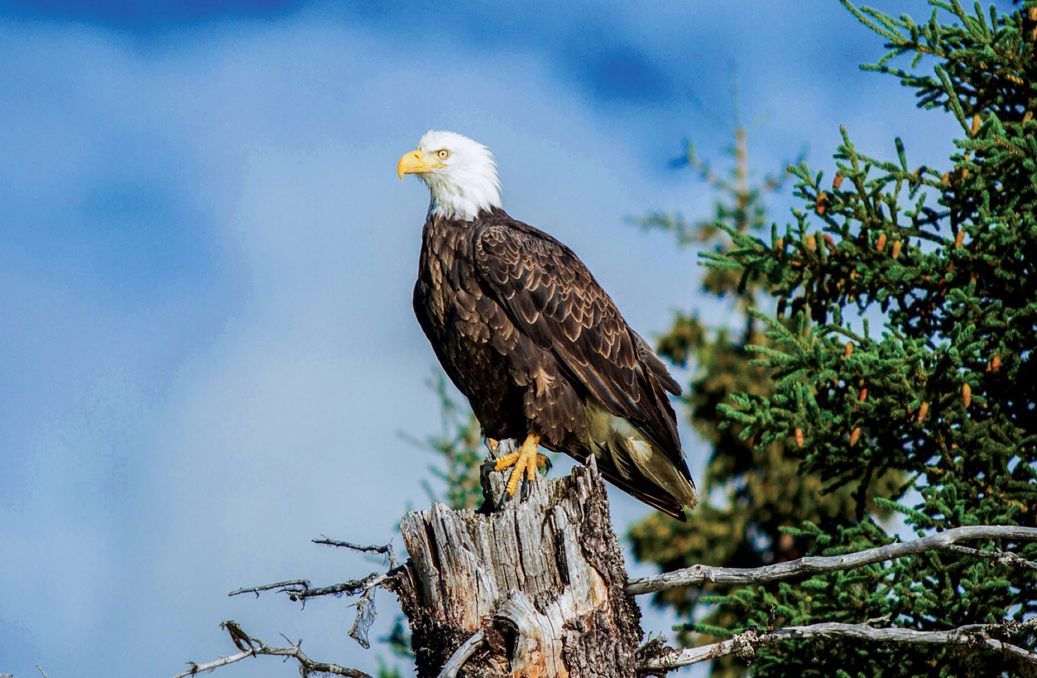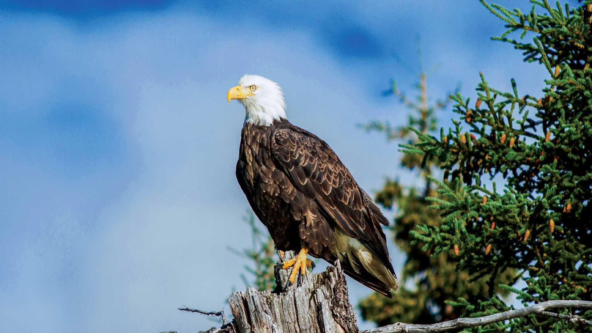 To catch a glimpse of the bald eagle, keep an eye to the sky. These raptors are built to soar with their long wings held flat, wide, and horizontal to catch the wind. It’s easy to identify an adult from this unique open flight and also because their “bald” white heads (really just white feathers that look bald in contrast to their dark brown body feathers) and plumed white tails distinguish them from other birds of prey. Juveniles are harder to identify, however, since the first four years of life they have dark brown feathers covering their bodies, including their heads, and lightly colored abdomens, which make them resemble other raptors.